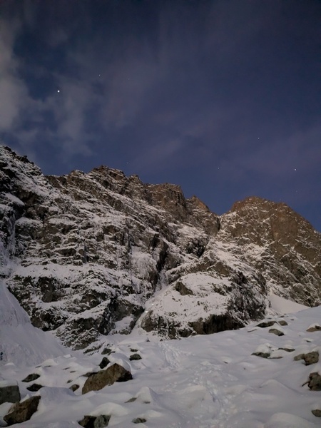 Un peu léger en glace. Avec le vent on a pris des spindrifts en permanence sur la journée. On a pris la variante de gauche au départ.