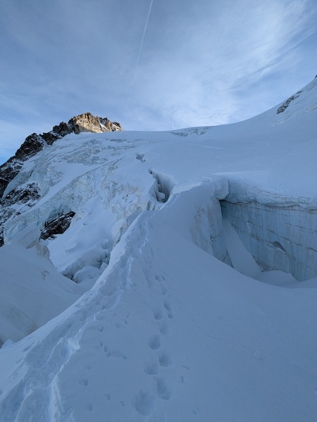 Couloir exposé aux chutes de pierre et glace si température douce. Crevasses si descente par les violettes