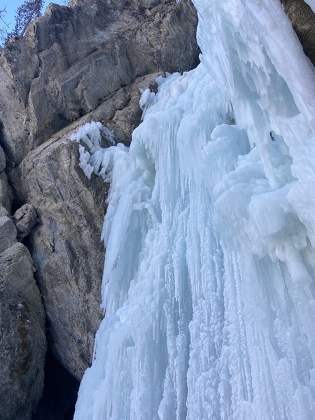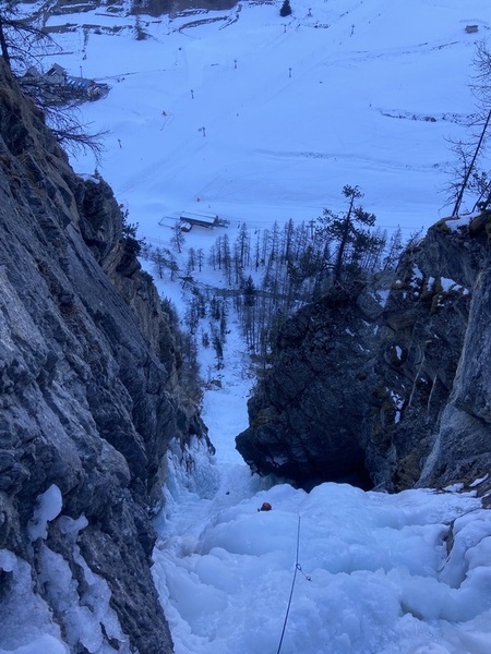 1ere longueur dans Sombre héros , pour constater que le cigare n’est pas complètement jointif sur le bas (mais presque!), et décision de retour Départ dans les formes du chaos après plusieurs cordées : conditions parfaites, toutes formes de glace présente, eau bien loin sous la glace.