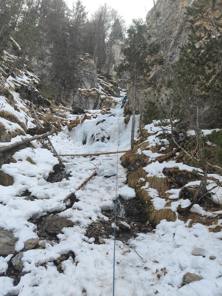 Y de droite : L1 ne passe plus sur la glace. Il faut faire le dry à gauche (3 pts sur 12 m) : attention gros bloc en équilibre que nous n'avons pas osé virer (du monde dessous?), et plusieurs prises ont cassé à notre passage, rocher bien pourri car plus tenu par le gel. Le reta de sortie passe encore car il y un peu de neige mais pour combien de temps? Les autres ressauts passent avec de la glace parfois très fine et l'eau qui coule fort dessous. Bref pour l'instant il vaut mieux aller voir Avatar que gratter le peu de glaçon qui reste...jusqu'au retour prolongé du froid (il faudra un peu de temps pour que ça se reforme). photos : Le dry et dans la cascade