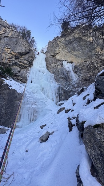 Belle cascade avec deux à trois lignes possible de 3+ à 4 À droite placages dont un qui peut se protéger correctement avec des broches petites ou moyennes sauf les 4/5 premiers mètres.